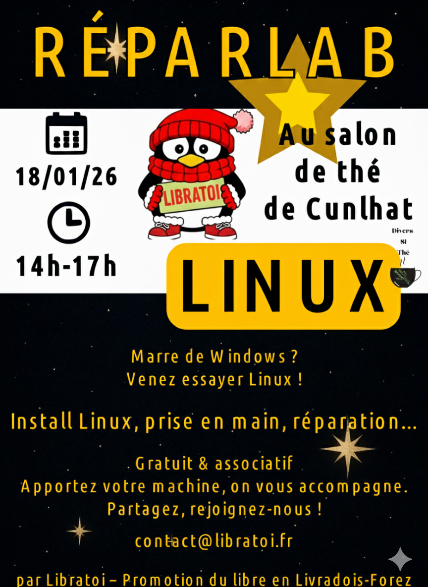 L'association organise des événements tels que le "ReparLab" pour installer et apprendre Linux, ou encore pour dépanner des ordinateurs.